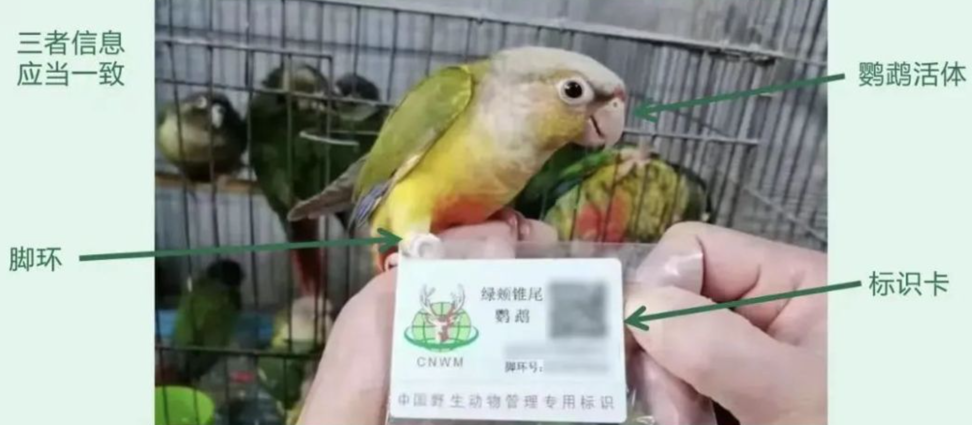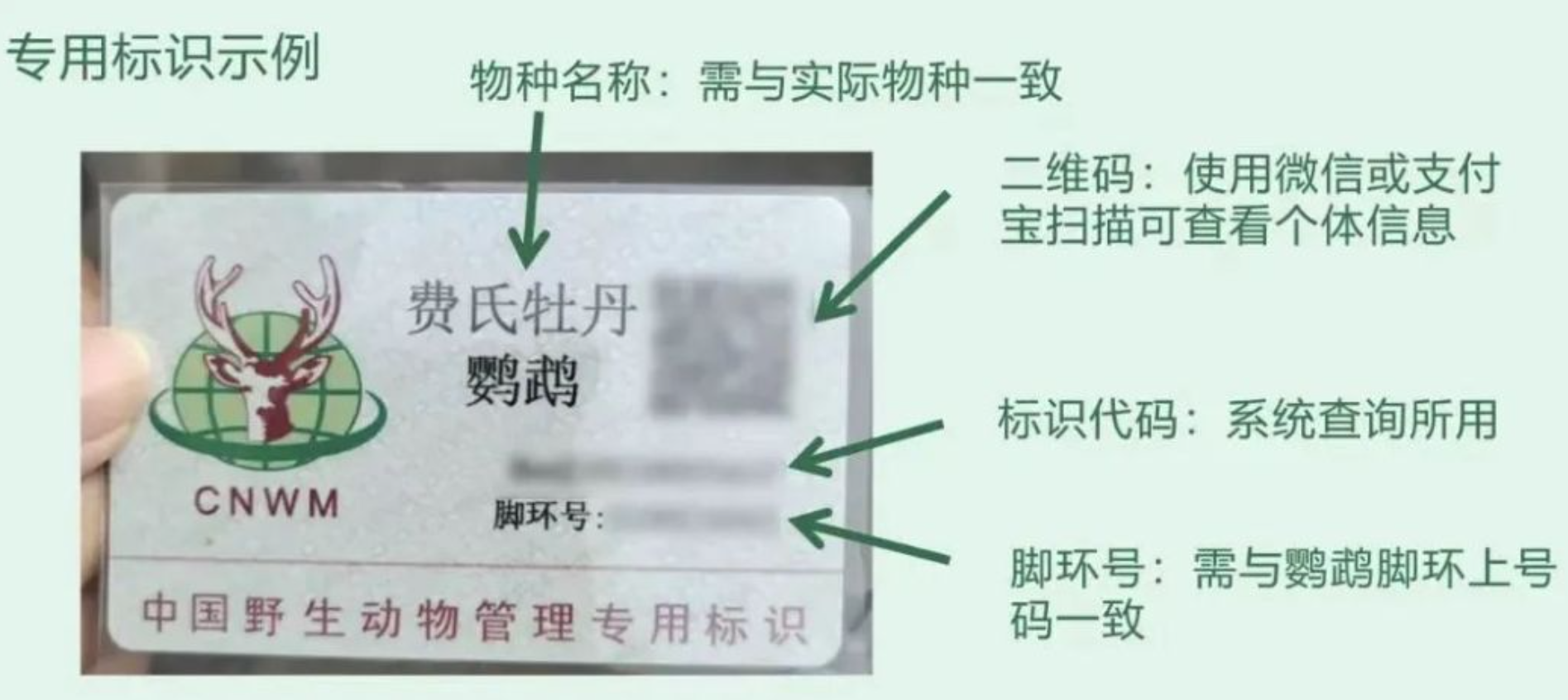 “脚环+标识卡”为一整套鹦鹉专用标识,且应与鹦鹉个体一一对应,不应分离。伪造、变造、买卖、转让、租借专用标识是违法行为,可能面临行政处罚甚至承担刑事责任的风险。